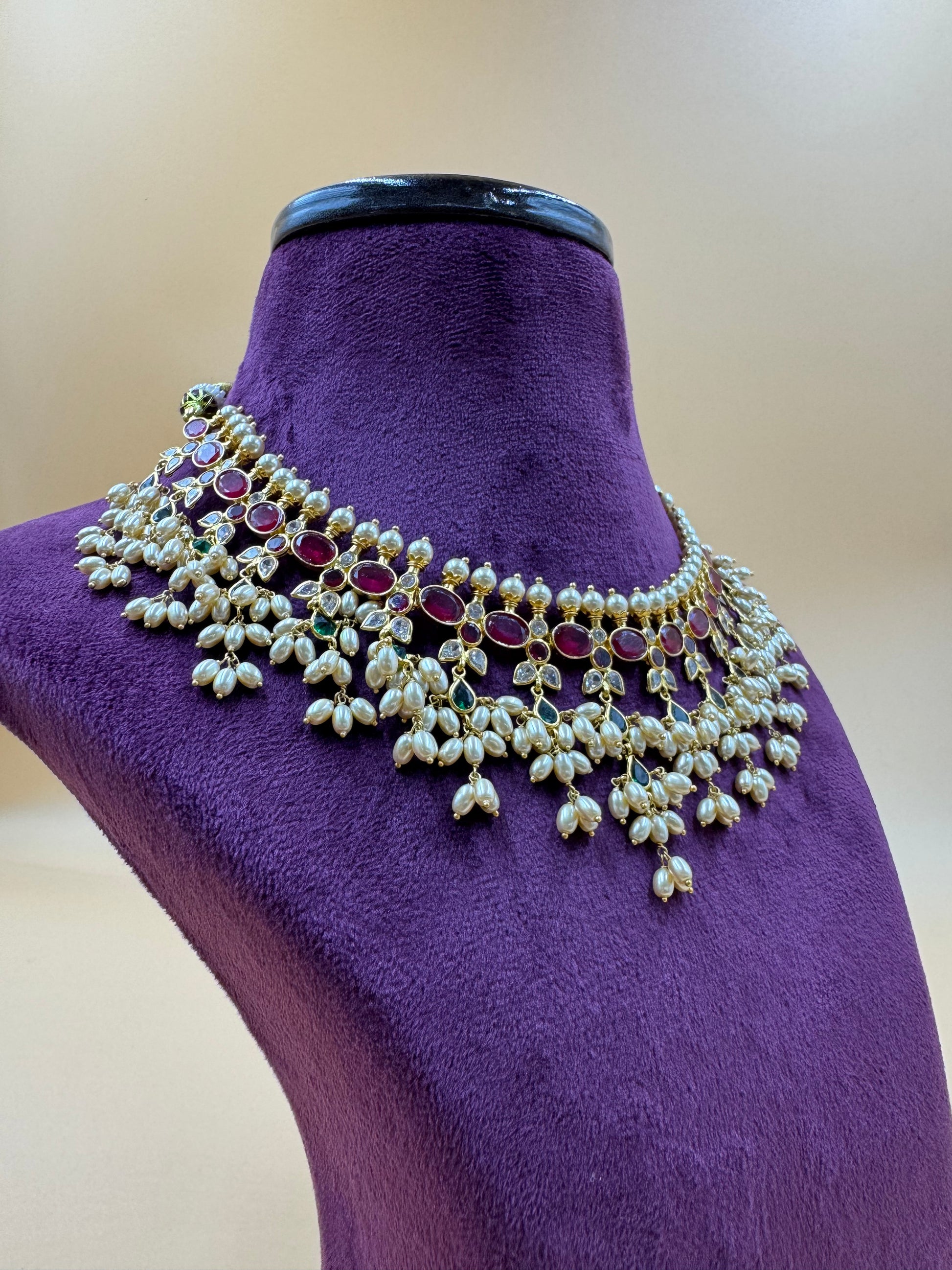 Elegantly crafted Guthi pusala ruby necklace featuring lustrous rice pearls. This traditional design showcases the perfect balance between vibrant ruby elements and delicate pearl formations. Each stone is meticulously set to ensure maximum brilliance, while the rice pearl accents add a sophisticated texture. An exquisite addition to both contemporary and classical ensembles.